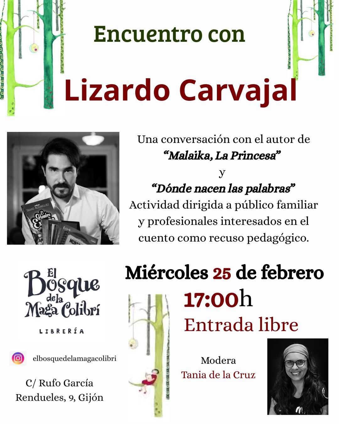 El miércoles 25 de febrero a las 17:00, El Bosque de la Maga Colibrí acoge un encuentro con el autor colombiano Lizardo Carvajal, con motivo del estreno en FETEN de la adaptación teatral de su libro Malaika, la princesa, producida por la compañía asturiana La Sonrisa del Lagarto. Publicada por La Maleta Ediciones, la obra...